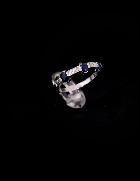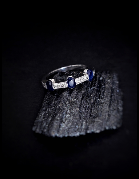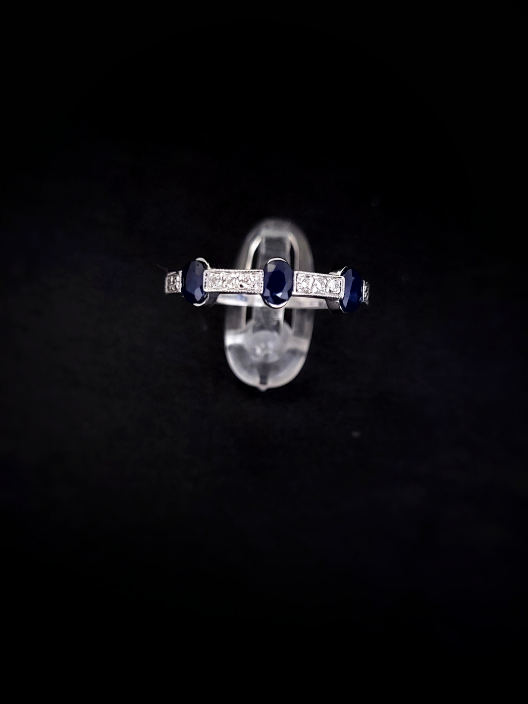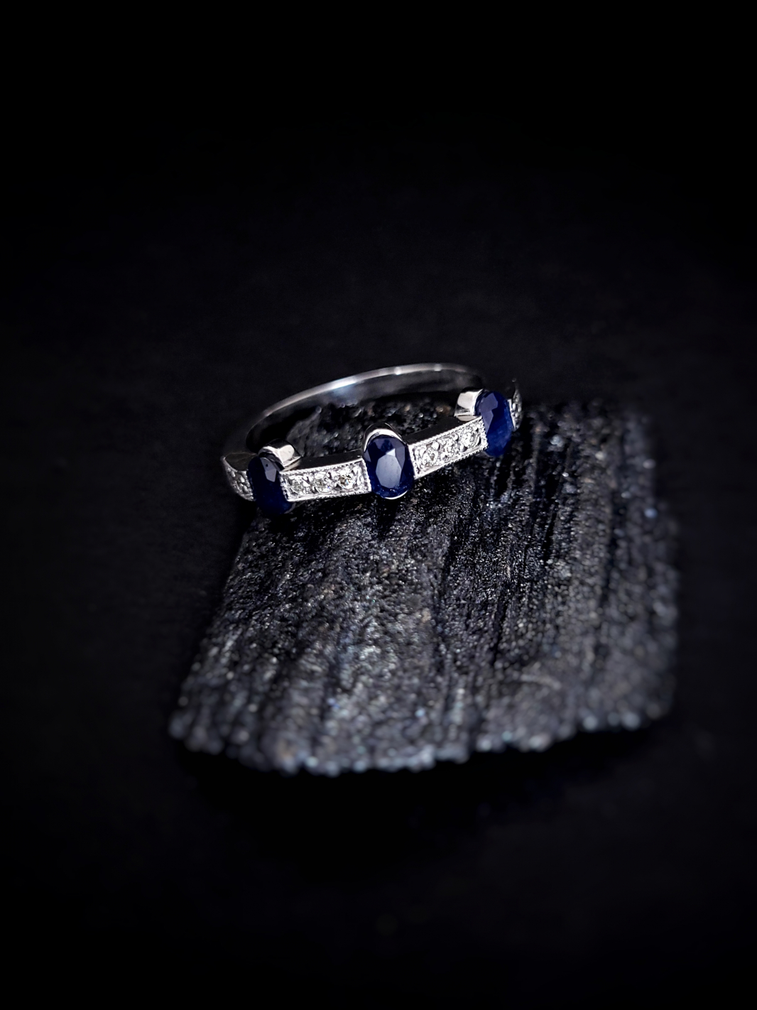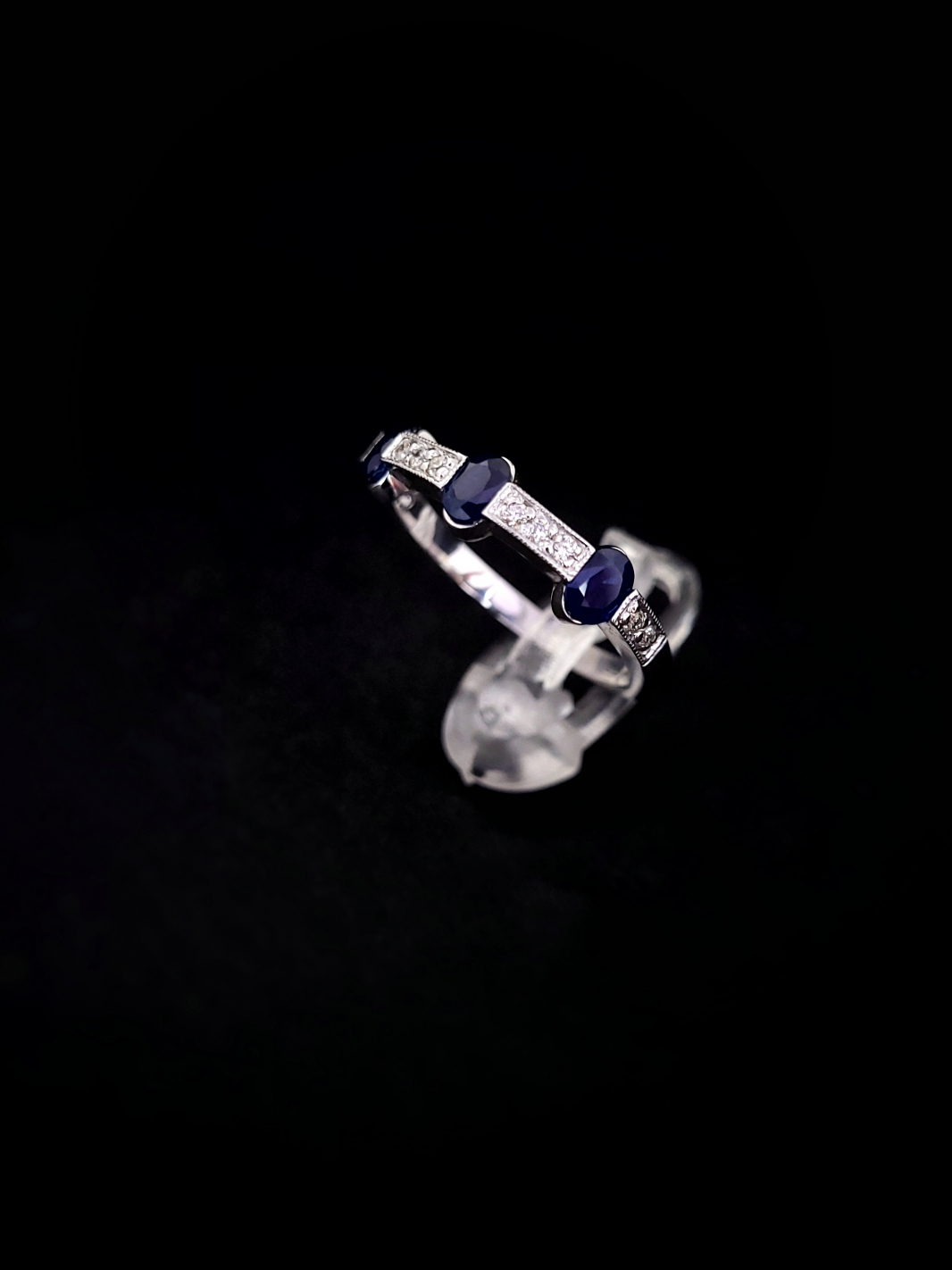 Elegantný prsteň z bieleho zlata zdobia žiarivé zafíry, ktoré mu dodávajú nadčasový a luxusný vzhľad. Precízne osadené brilianty zvýrazňujú jeho jemnú krásu a robia z neho dokonalý šperk na výnimočné príležitosti aj každodenné nosenie.
