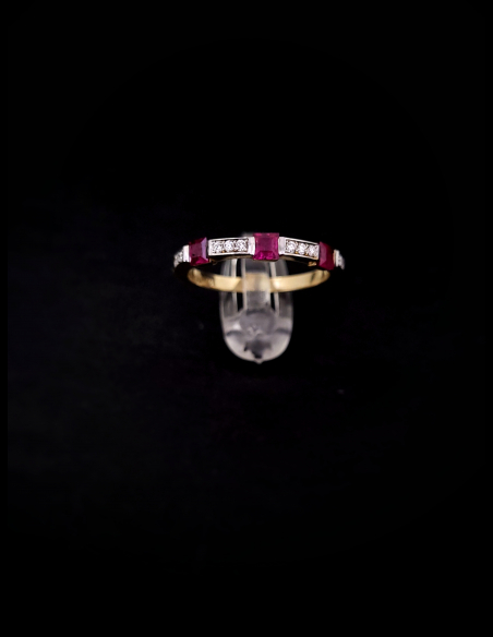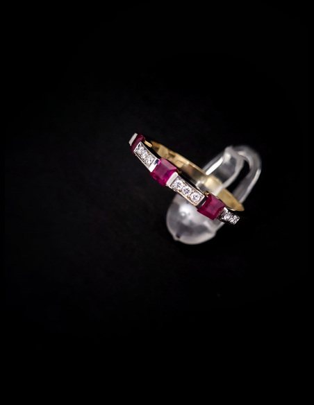 Prsteň zdobí striedanie žiarivých briliantov a hlbokých červených rubínov, ktoré vytvárajú elegantný a luxusný efekt. Jemné vsadenie kameňov zabezpečuje dokonalý odlesk a sofistikovanú hru svetla pri každom pohybe ruky. Rubíny symbolizujú vášeň, lásku a odvahu.