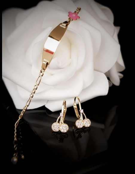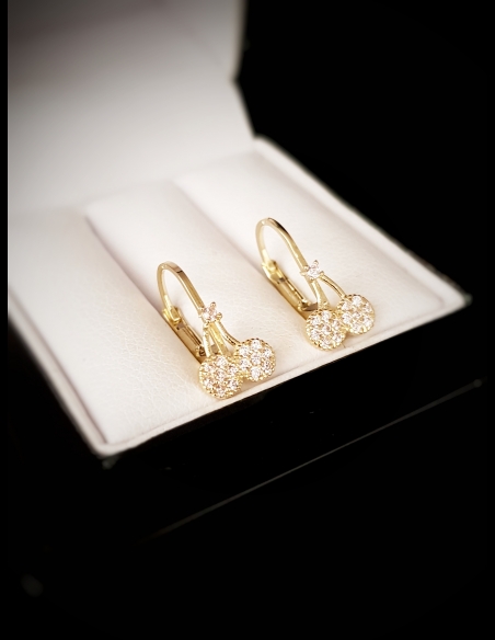 Detské zlaté náušnice čerešničky s ružovými zirkónmi